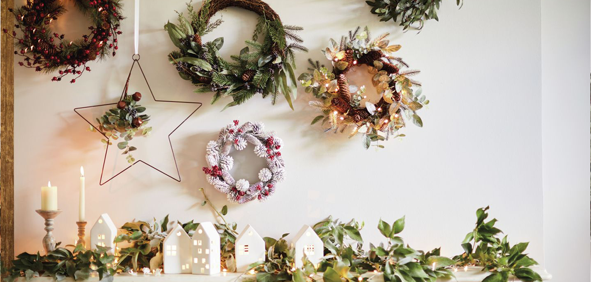 Never underestimate the impact of a well-placed wreath. Hang a larger one in the center of your bookcase for a simple seasonal display, or position smaller ones along your mantels, or place a few small ones gallery-style with the art on your walls for a bolder (but small space-friendly) scene.